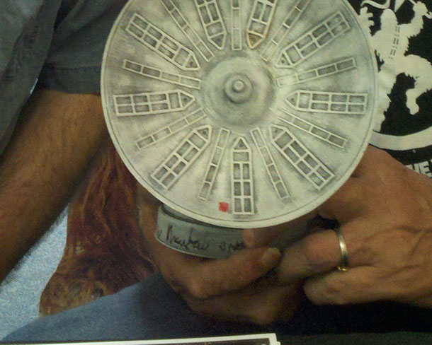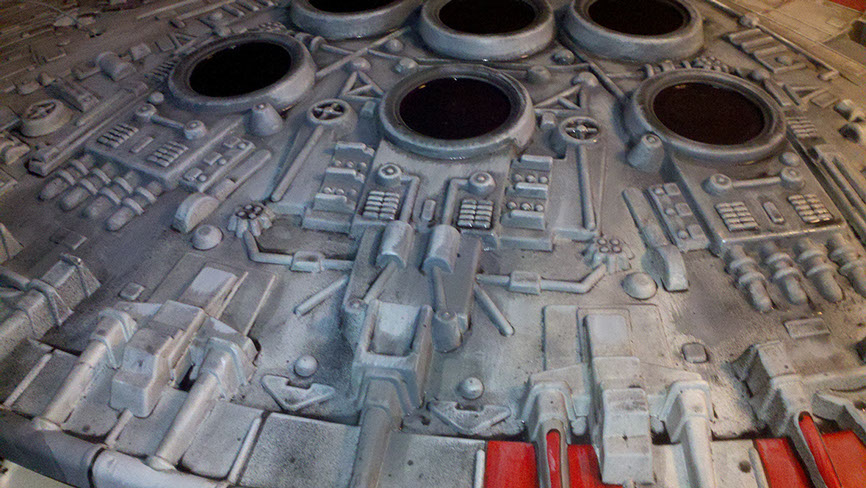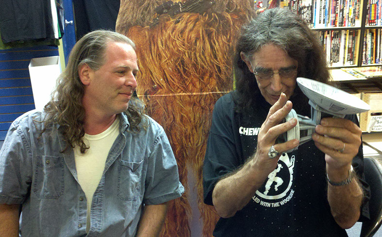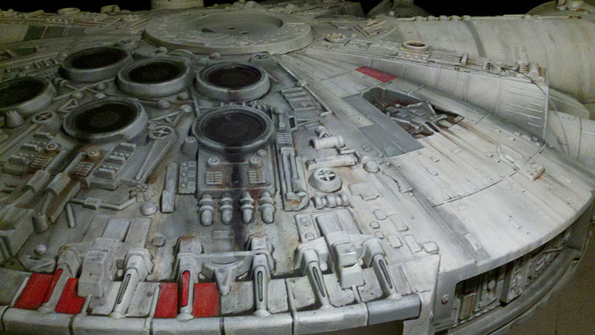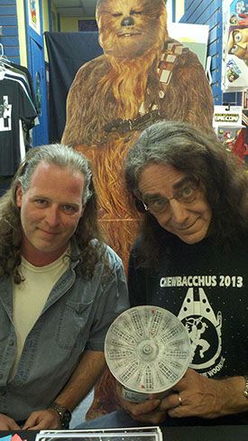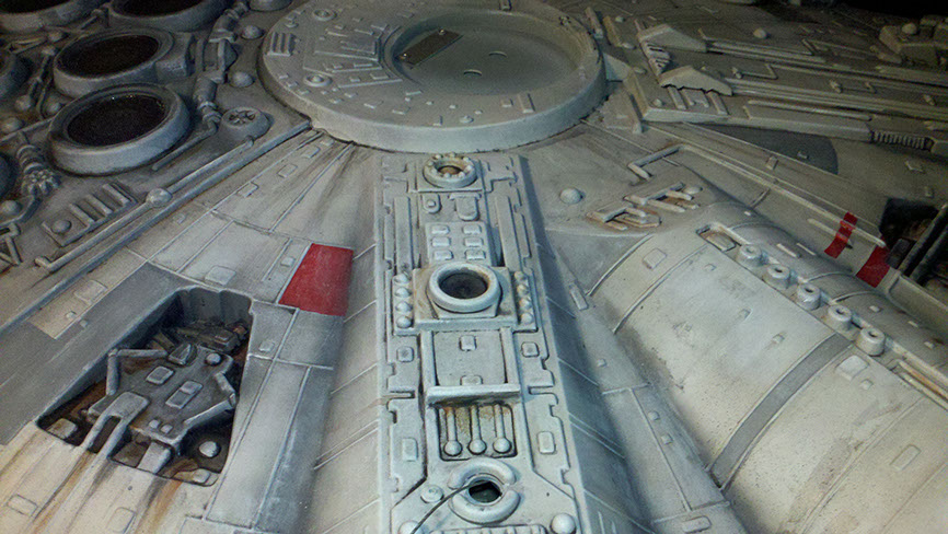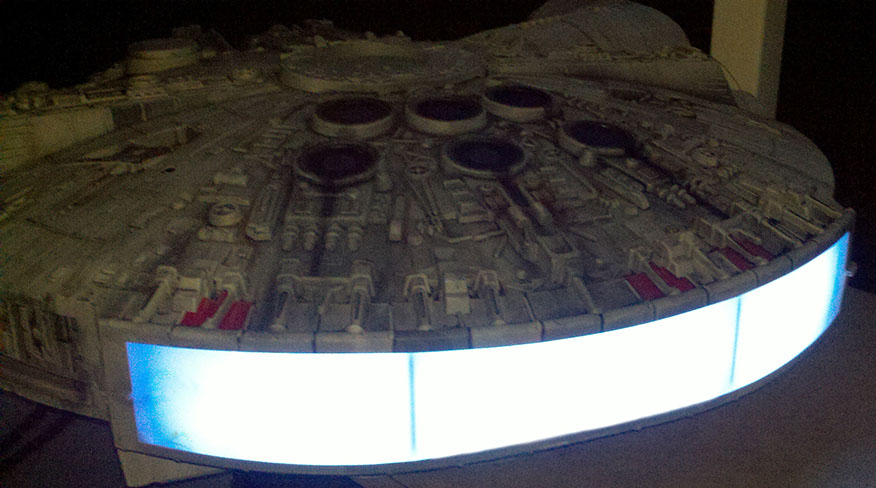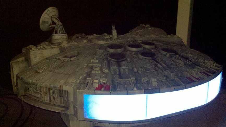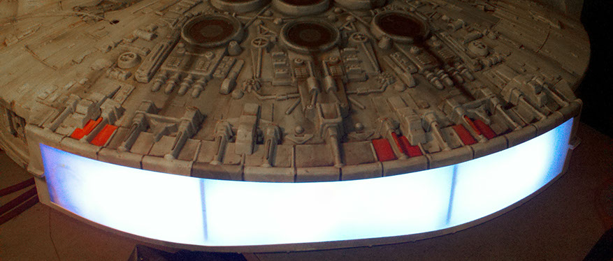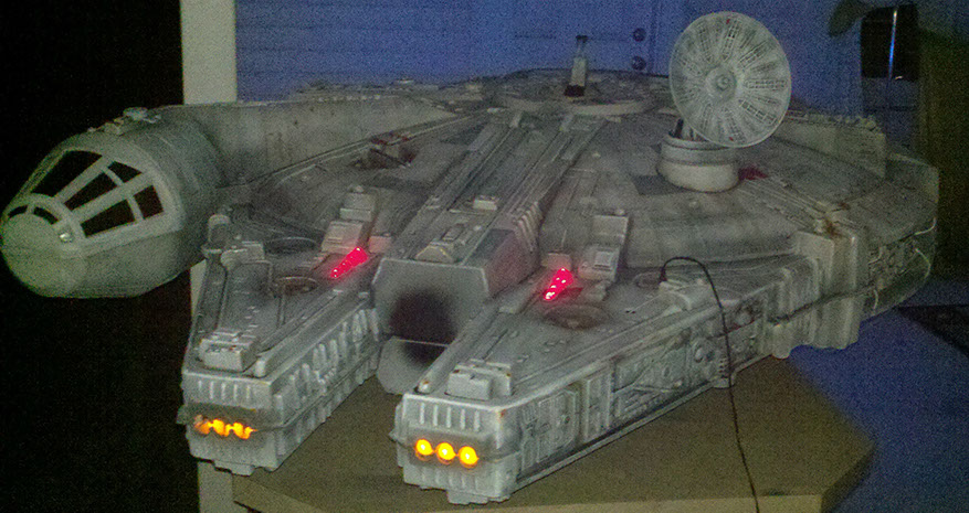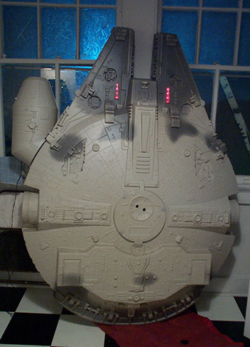 I won the Toys R Us Millennium Falcon Extraordinaire in a contest sponsored by Rosie O'Donell for All The Kids Foundation. It came from the Fulton St. TRU in Brooklyn, NY. I donated $3 at the register for 3 chances. 200,000 entires, 700 models made, and I got one. Go figure. I carried this 6x4x2ft. Falcon (scaled with the action figures) from Brooklyn, to Jersey City, to New Orleans to Metairie. I acquired the original power cord from the store. The front yellow light and top and bottom cannons work. I decided to paint it and light it up further in 2013. The rear engine is lit up by blue and white , battery-powered LEDs. It's one of the largest, accurately painted, Millennium Falcons ever. And it's signed by Boba Fett (Jeremy Bullock) and Chewbacca (Peter Mayhew). $3500.